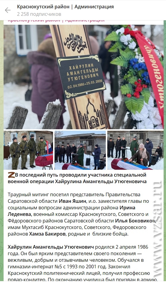 Амангельды Хайрулин родился 2 апреля 1986 года и после обучения в школе окончил Краснокутский политехнический лицей, получил профессию "повар-кондитер". После получения профессии был призван в армию, служил на Дальнем Востоке поваром. Заключил контракт о прохождении службы в рядах ВС РФ и 25 марта прошлого года погиб при выполнении задач в ходе СВО.