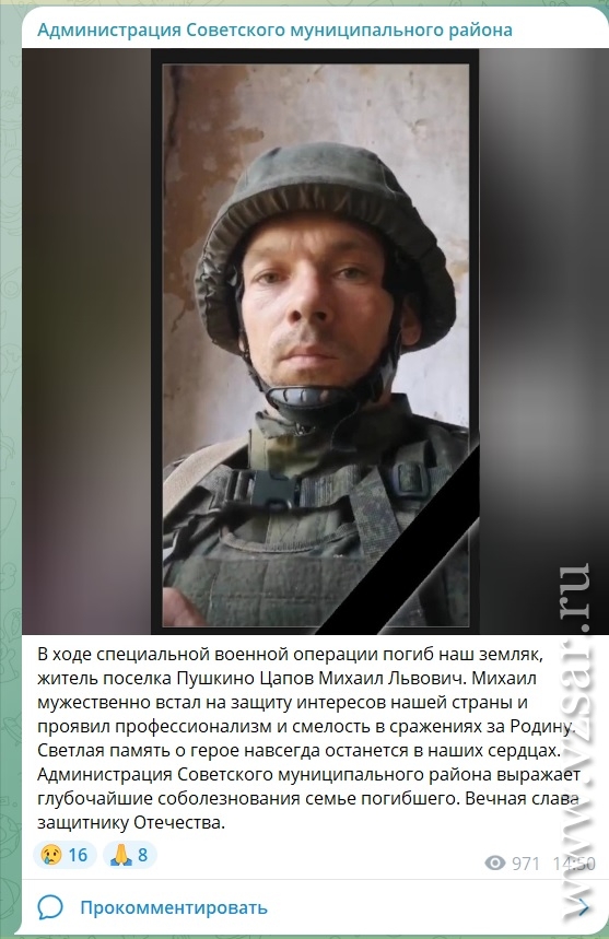 Администрация Советского района сообщила о том, что с фронта не вернулся живым житель поселка Пушкино Михаил Цапов.