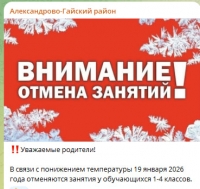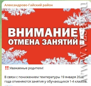 "В связи с понижением температуры 19 января 2026 года отменяются занятия у обучающихся 1-4 классов", - говорится в сообщении райадминистрации.