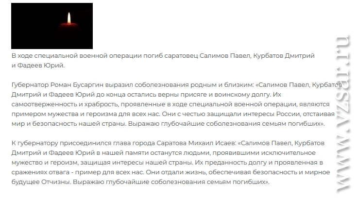 А мэрия Саратова традиционно коротко проинформировала о гибели Павла Салимова, Дмитрия Курбатова и Юрия Фадеева.