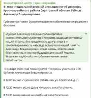 Так, волонтерский центр Красноармейска рассказал, что завтра состоится прощание с Александром Буйловым. Его похоронят в селе Рогаткино.