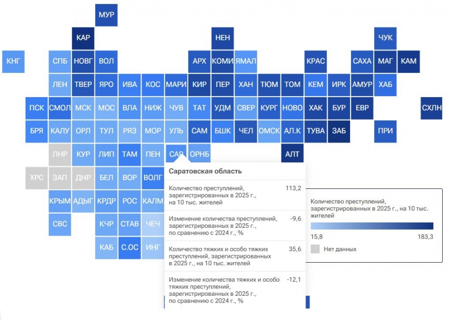 Саратовская область заняла в рейтинге 37-ю строчку против 33-й и 29-й по итогам 2024-го и 2023 годов соответственно. В нашей губернии уровень преступности в прошлом году составил 113,2 преступления на 10 тыс. жителей (ранее 124,4 и 122,2), что на 9,6% ниже показателя позапрошлого года. При этом показатель тяжких и особо тяжких криминальных деяний составил 35,6 на 10 тыс. населения против 40,2 годом ранее (снижение на 12,1%).