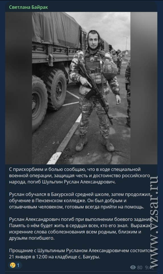 Глава Екатериновского района Светлана Байрак сообщила о смерти Руслана Шульпина, который обучался в Бакурской средней школе, затем продолжил обучение в Пензенском колледже и, будучи военнослужащим, погиб при выполнении боевого задания.