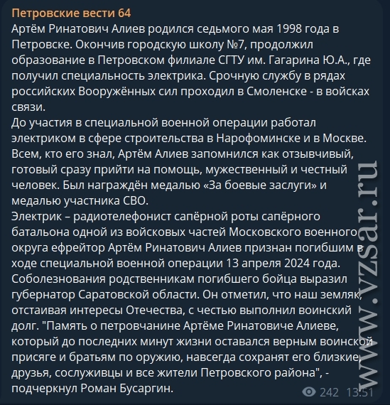 Электрик-радиотелефонист саперной роты, ефрейтор Артем Алиев не вернулся с боевого задания 13 апреля 2024 года.
