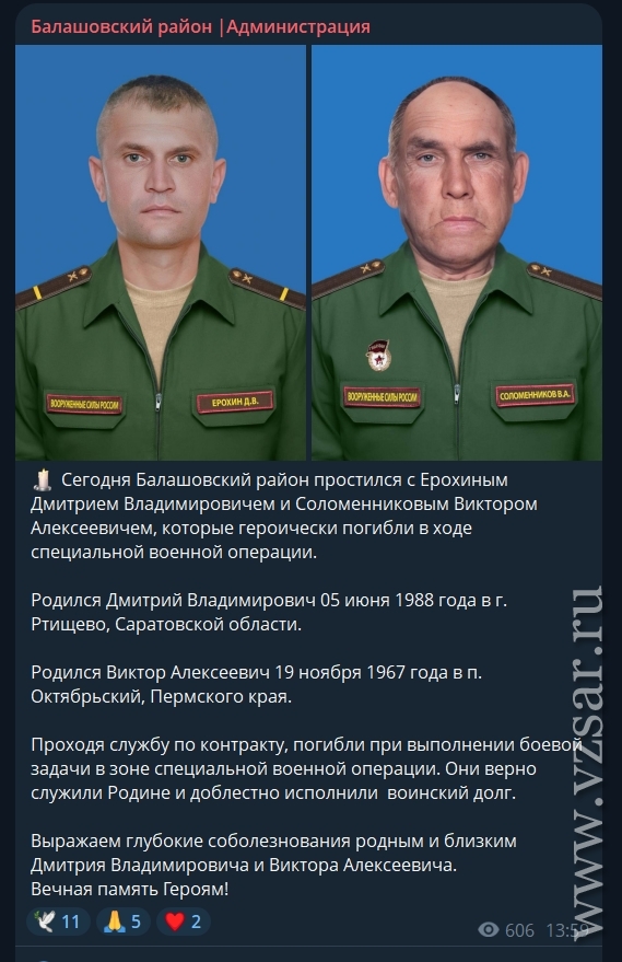 Администрация Балашовского района сообщает о прощании с Дмитрием Ерохиным и Виктором Соломенниковым.