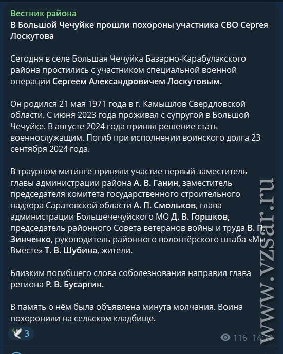 Газета Базарно-Карабулакского района "Вестник района" уведомила о том, что с фронта не вернулся живым Сергей Лоскутов.