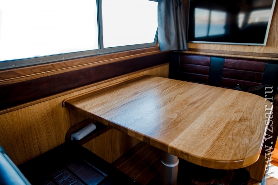 В частности, внутренняя отделка судна должна быть выполнена из дерева, а сиденья рулевого и диван обтянуты натуральной кожей.