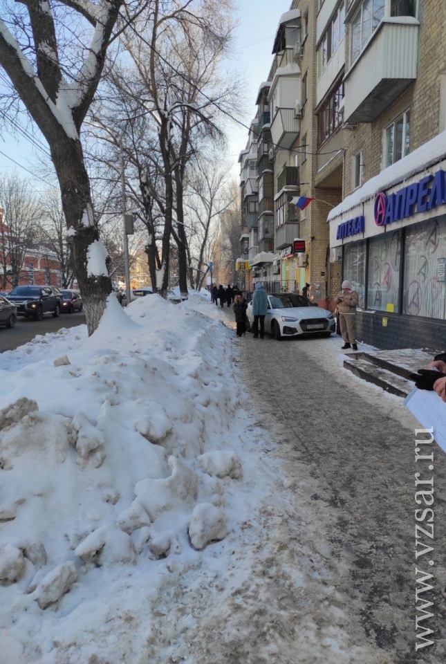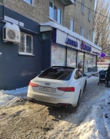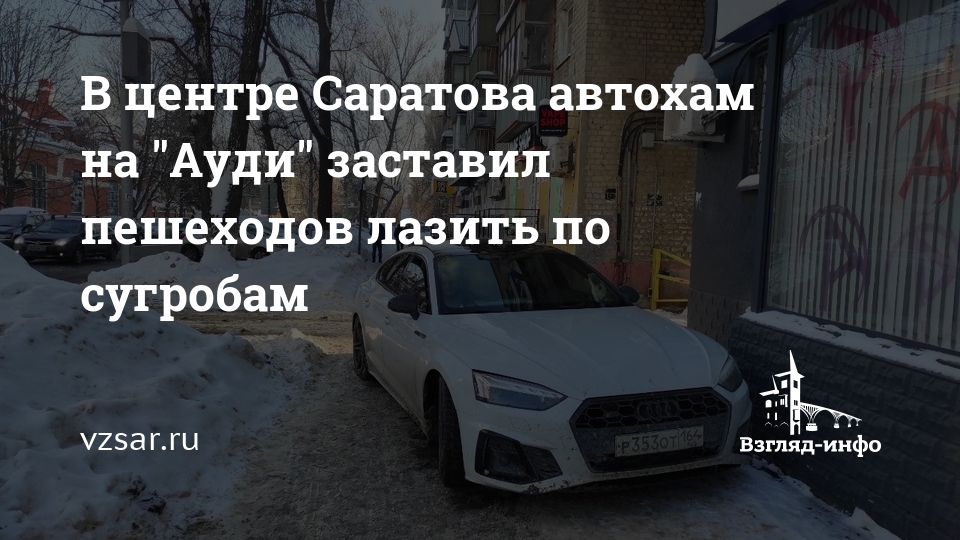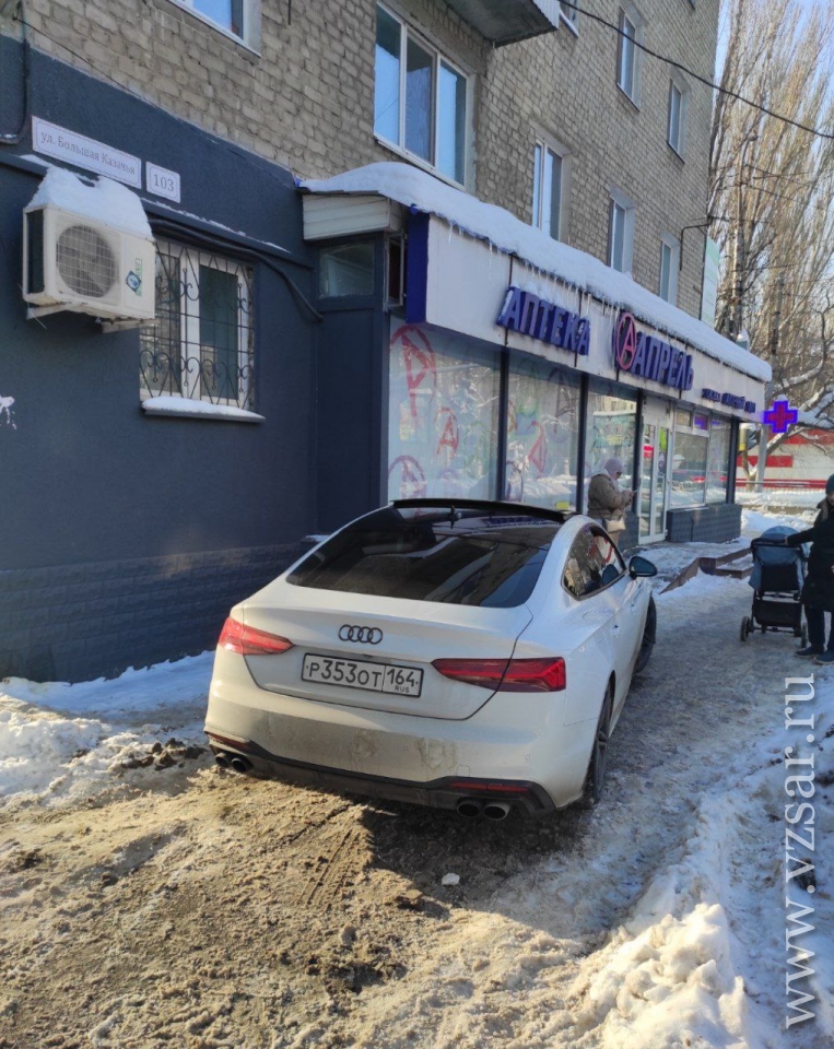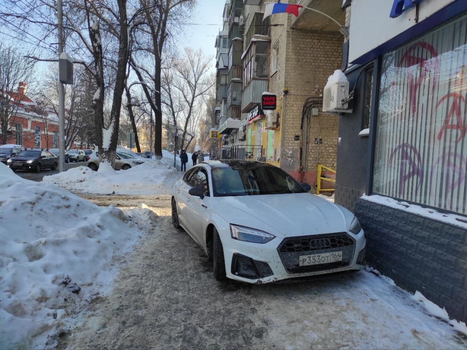 "В 14.15 водитель автомобиля "Ауди" с госномером Р 353 ОТ 164 припарковался на тротуаре у дома № 103 по улице Большая Казачья, перегородив путь пешеходам, которым приходилось по сугробам обходить иномарку.