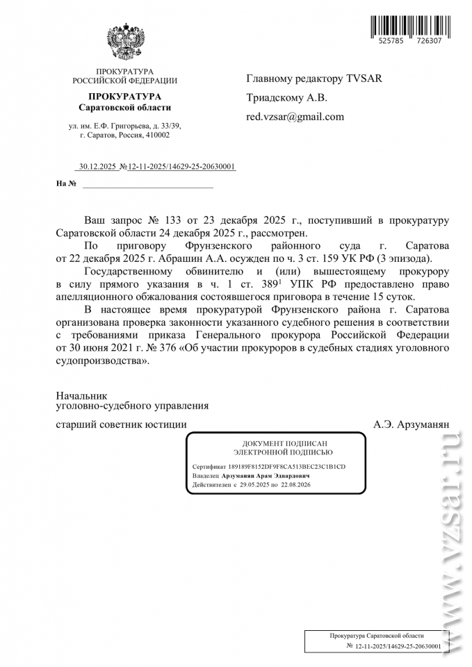 Планирует ли прокуратура Саратовской области использовать свое право на апелляционное обжалование приговора Фрунзенского районного суда г. Саратова по уголовному делу в отношении Андрея Абрашина в связи с мягкостью назначенного наказания?" - в частности, говорилось в документе.