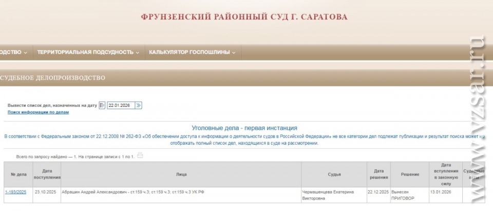 Соответствующая информация содержится в картотеке дел Фрунзенского райсуда Саратова.
