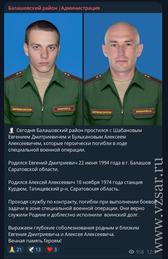 Администрация Балашовского района рассказала о прошедшем сегодня прощании с Евгением Шабановым и Алексеем Булькановым.