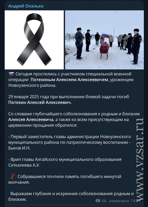 Глава Новоузенского района Андрей Опалько рассказал о прошедшем сегодня прощании с Алексеем Потехиным, который погиб еще 29 января прошлого года.