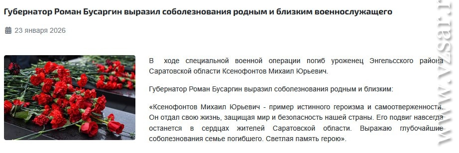 Администрация Энгельсского района без подробностей сообщила о гибели Михаила Ксенофонтова.