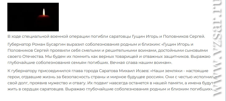 Администрация Саратова без подробностей сообщила о гибели Игоря Гущина и Сергея Половникова.