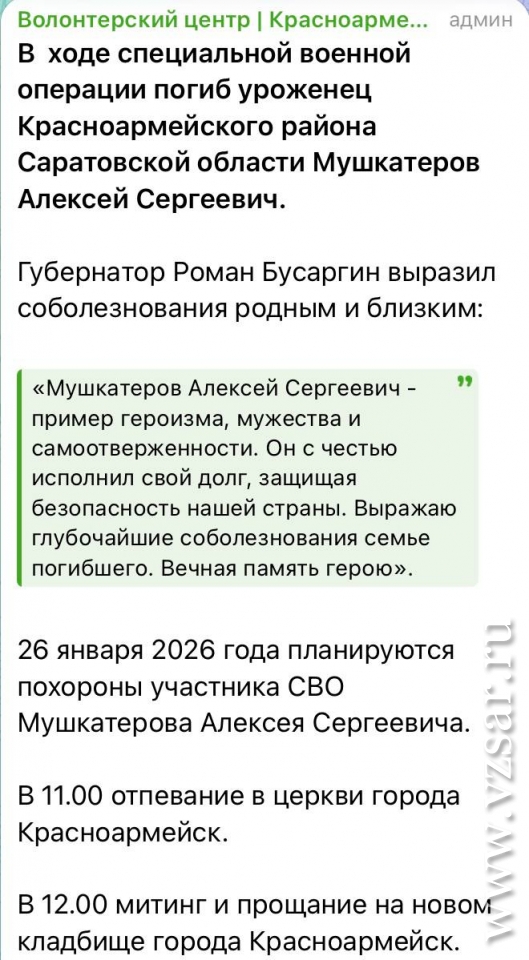 Волонтерский центр Красноармейского района сообщает, что завтра в райцентре состоится прощание с Алексеем Мушкатеровым.