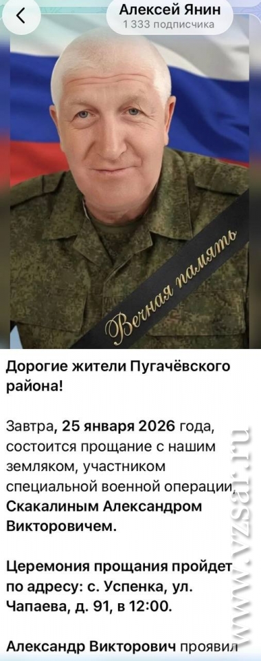 В Пугачевском районе сегодня состоялось прощание с Александром Скакалиным, сообщил глава муниципалитета Алексей Янин.
