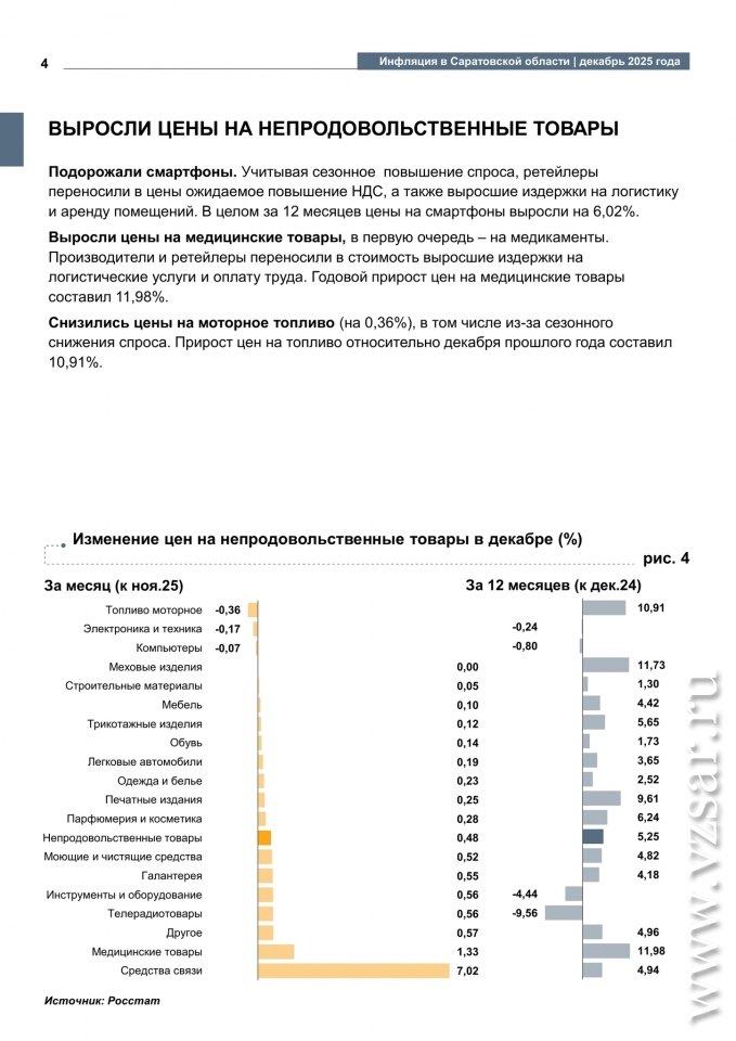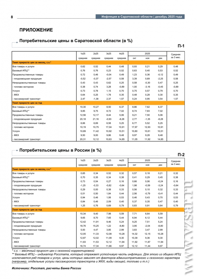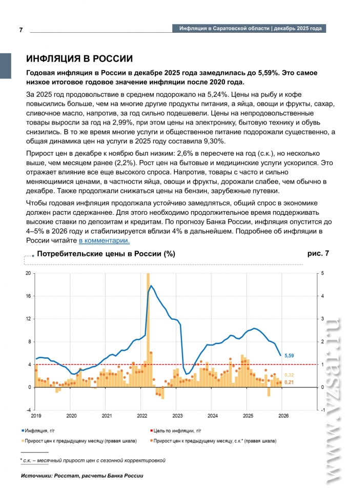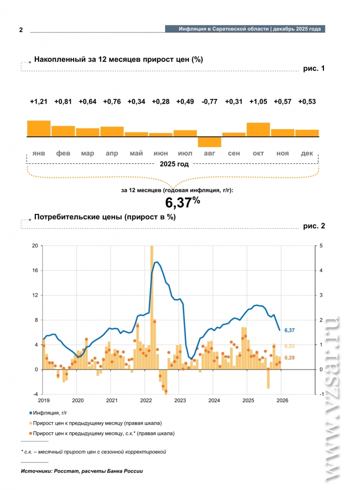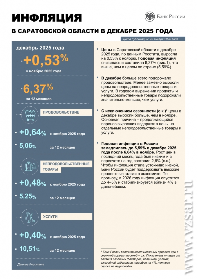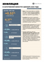 По итогам 2025 года инфляция в Саратовской области составила 6,37%, что выше показателя по РФ (5,59%), сообщает Банк России.