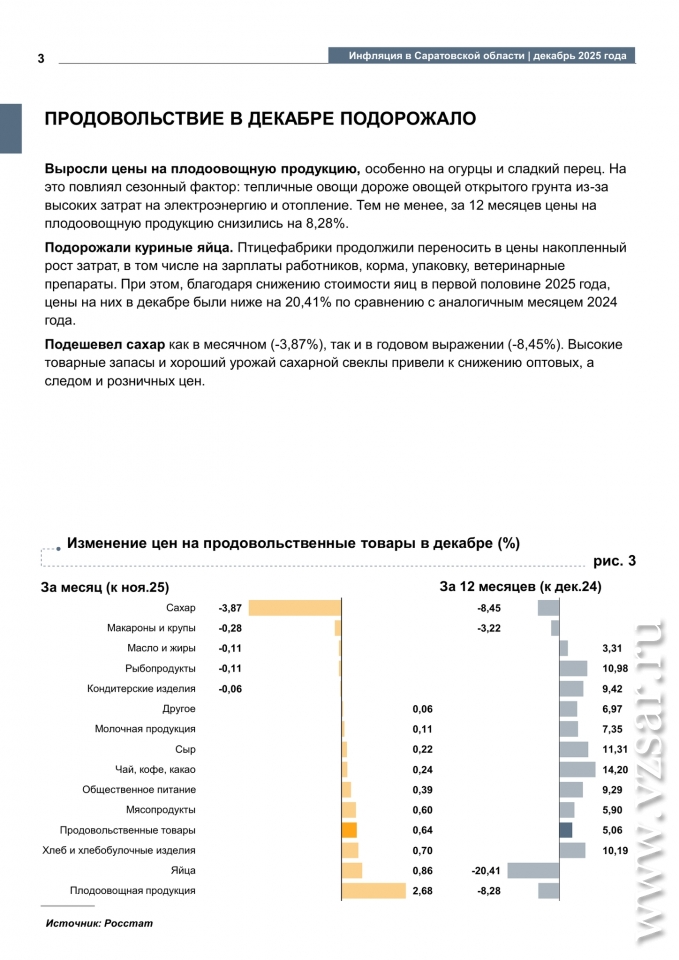 В разрезе года цены на плодоовощную продукцию снизились на 8,28%, на сахар - на 8,45%, а на яйца - на 20,41%. Заметный рост в 2025-м показали чай, кофе, какао (+14,20%), сыр (+11,31%), хлеб и хлебобулочные изделия (+10,19%), кондитерские изделия (+9,42%) и рыбопродукты (+10,98%).