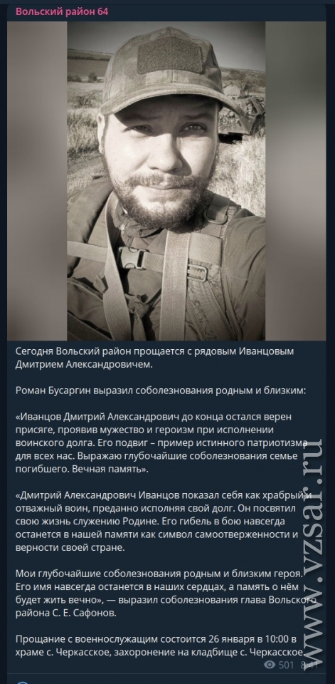 Также вчера в селе Черкасское Вольского района земляки простились с военнослужащим Дмитрием Иванцовым, рассказали местные власти.