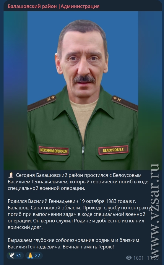 Вчера в Балашовском районе прошла церемония прощании с Василием Белоусовым. Василий Геннадьевич родился 19 октября 1983 года в Балашове. Проходил службу по контракту и погиб при выполнении задач на СВО, сообщили в районной администрации.