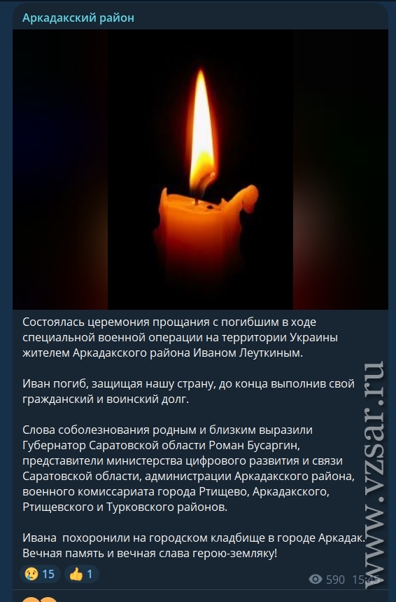 А администрация Аркадакского района сообщила о прошедшем прощании с Иваном Леуткиным.