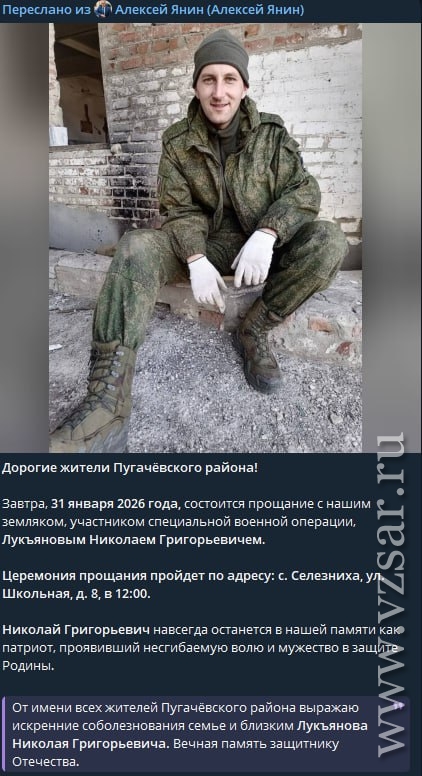 А сегодня в селе Селезниха прошла церемония прощания с военнослужащим Николаем Лукьяновым. О гибели Николая Григорьевича коротко сообщил глава Пугачевского района.
