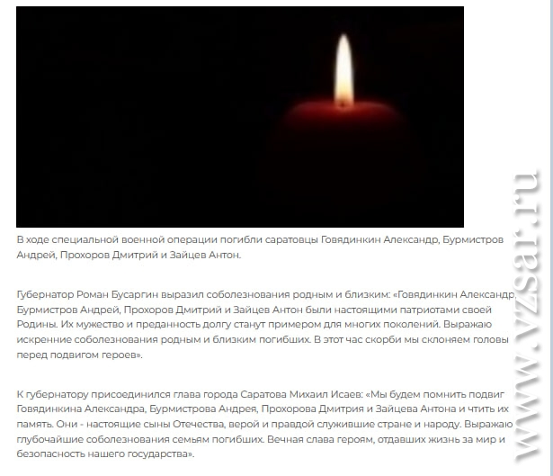 Администрация Саратова без подробностей сообщила о гибели Александра Говядинкина, Андрея Бурмистрова, Дмитрия Прохорова и Антона Зайцева.