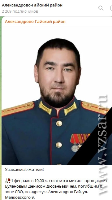 Администрация Александрово-Гайского района сообщила, что сегодня в последний путь проводили Дениса Буланова.