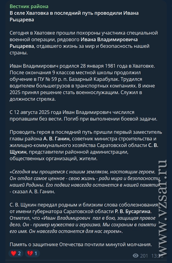 Базарно-Карабулакское издание "Вестник района" рассказало о прошедшем в селе Хватовка прощании с погибшим Иваном Рыцаревым.