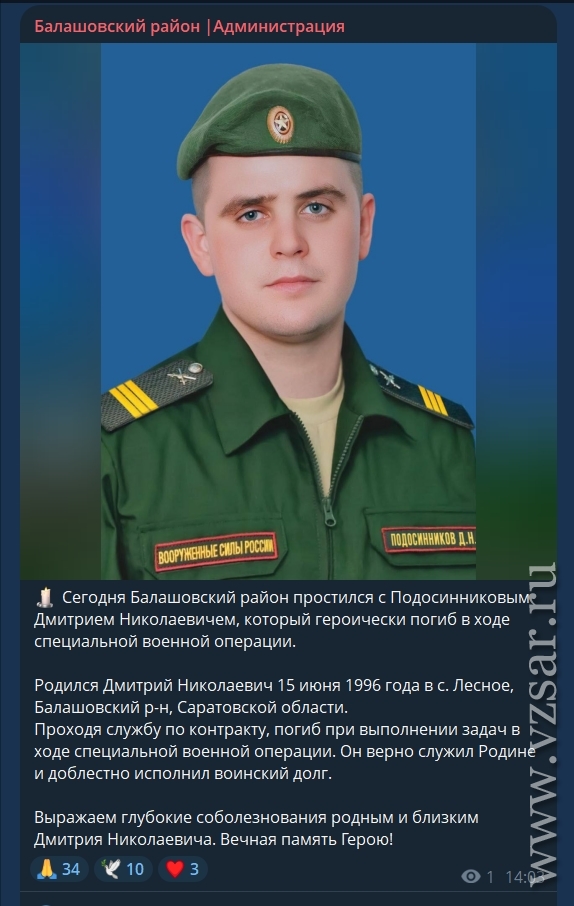 Администрация Балашовского района рассказала о прошедшем прощании с Дмитрием Подосинниковым.
