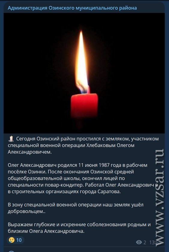 Также администрация Озинского района сообщила о том, что в последний путь проводили Олега Хлебакова.
