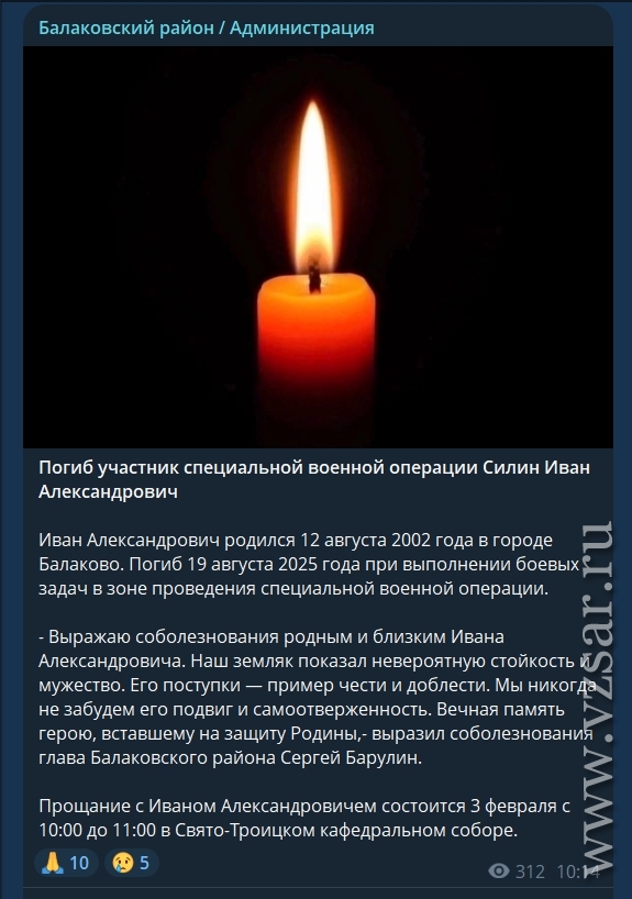 Администрация Балаковского района рассказала, что завтра состоится прощание с Иваном Силиным, а в среду - с Андреем Зелениным (оба – уроженцы Балакова).