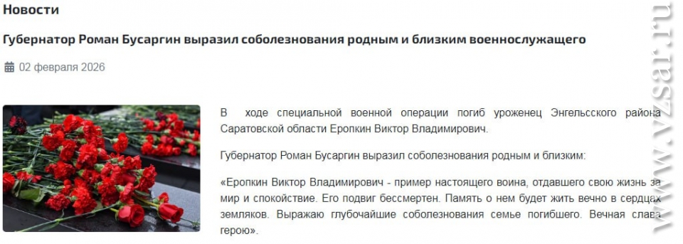 Администрация Энгельсского района без подробностей сообщила о гибели Виктора Еропкина.