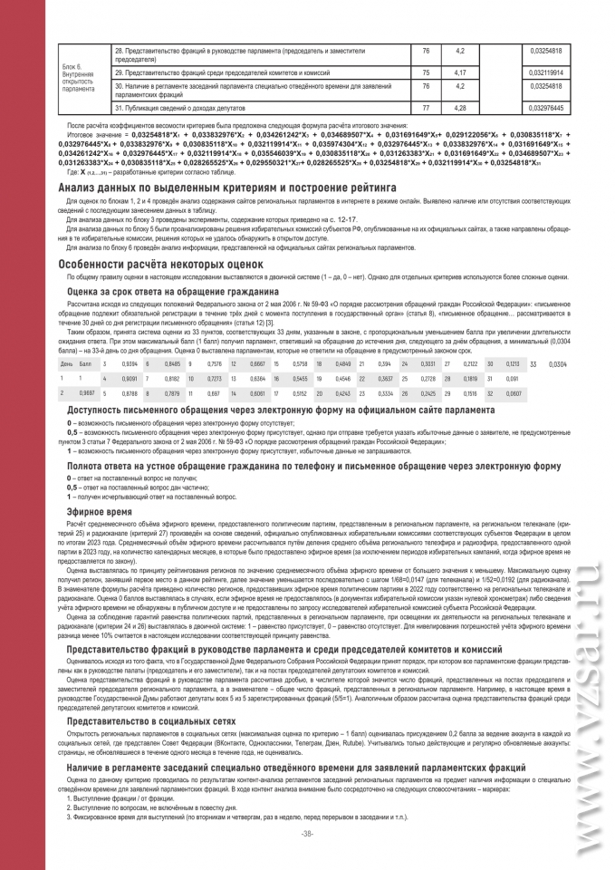 Критерии оценки региональных заксобраний были сгруппированы в шесть тематических блоков - по открытости принятия решений (1), законодательной работы (2) и обратной связи с гражданами (3), по социальной доступности парламента (4), обеспечению гарантий равенства партий (5) и внутренней открытости парламента (6).