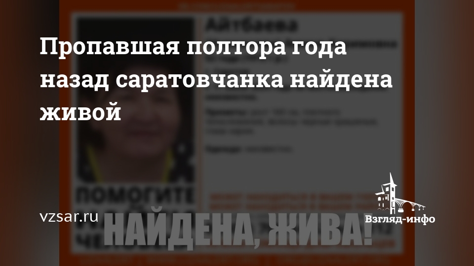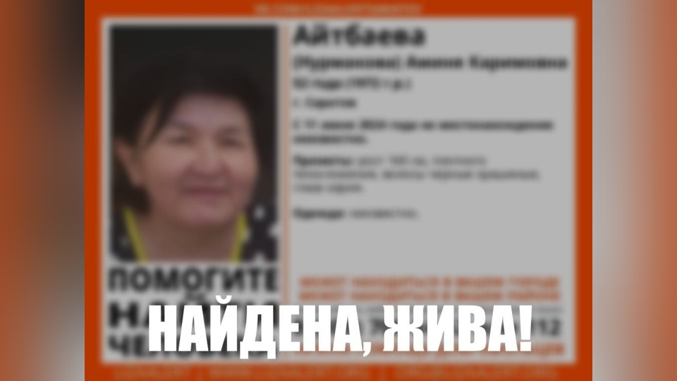 Пропавшая 52-летняя Аминя Айтбаева (Нурмакова) из Саратова найдена живой. Об этом сообщает поисковый отряд "Лиза Алерт Саратов".