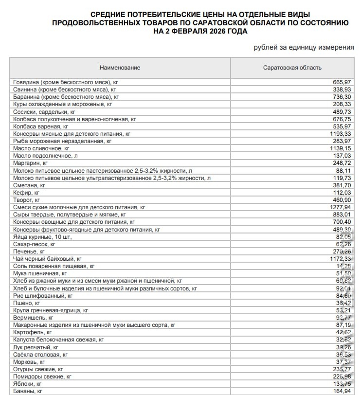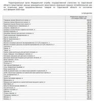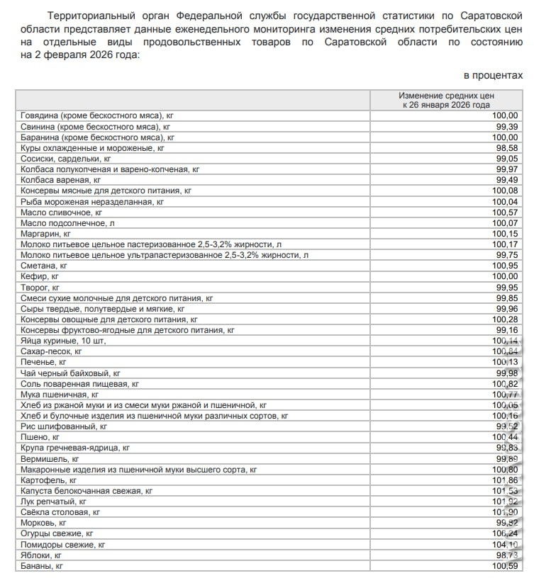 На 2 февраля средняя цена сахара-песка в регионе составляла 62,26 руб./кг, муки – 51,5 руб./кг, десятка яиц – 82,05 руб., масла подсолнечного – 137,03 руб./л, масла сливочного – 1139,15 руб./кг, сметаны – 381,7 руб./кг, кур охлажденных и мороженых – 208,33 руб./кг, капусты - 32,82 руб./кг, свеклы – 36,53 руб./кг, лука – 39,26 руб./кг, картофеля – 42,62 руб./кг, макарон – 87,19 руб./кг, огурцов – 235,77 руб./кг, помидоров – 225,98 руб./кг, бананов - 164,94 руб./кг.