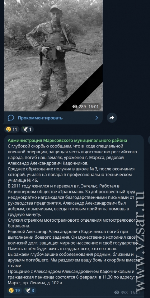 Администрация Марксовского района рассказала, что сегодня пройдет прощание с погибшим Александром Кадочниковым.