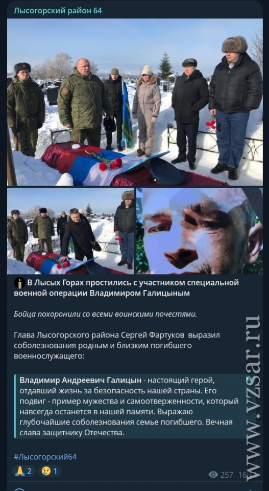 Администрация Лысогорского района сообщила о прошедшем в райцентре прощании с Владимиром Галицыным.