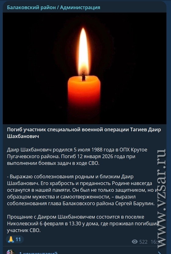 Также администрация Балаковского района рассказала, что сегодня в поселке Николевский пройдет прощание с Даиром Тагиевым.