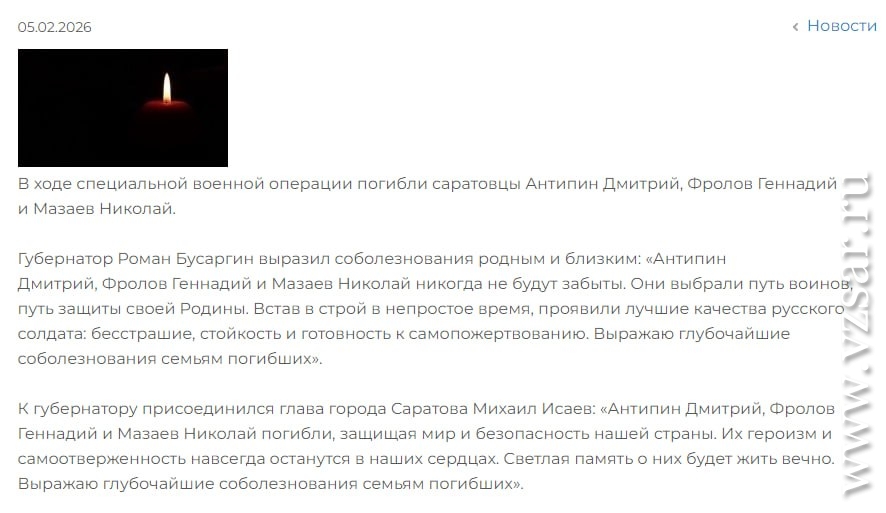 Администрация Саратова без подробностей сообщила о гибели Дмитрия Антипина, Геннадия Фролова и Николая Мазаева.