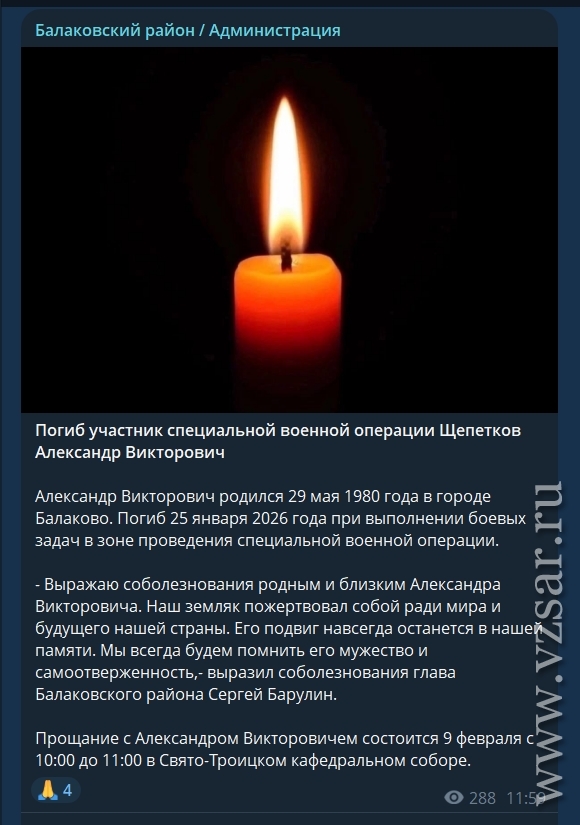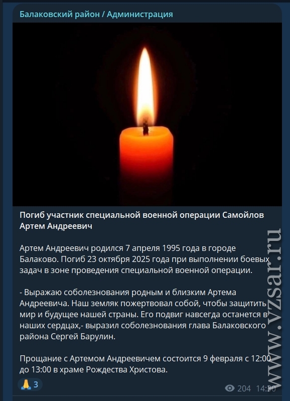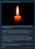 Администрация Балаковского района рассказала, что в понедельник 9 февраля состоится прощание с погибшими Артемом Самойловым и Александром Щепетковым.