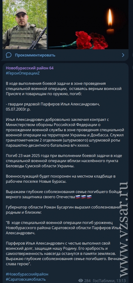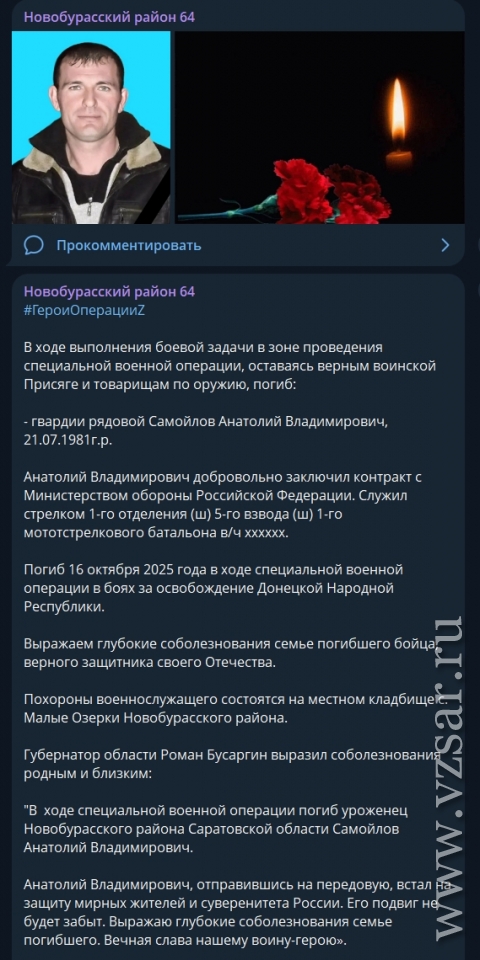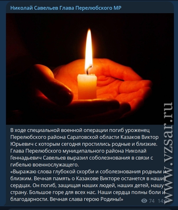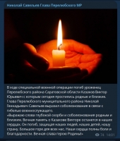 Также глава Перелюбского района Николай Савельев сообщил о гибели Виктора Казакова.