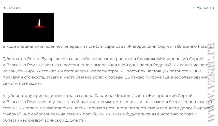 Администрация Саратова без подробностей сообщила о гибели Сергея Живоронского и Романа Власенко.