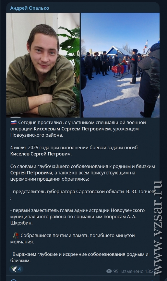 Глава Новоузенского района Андрей Опалько рассказал о прошедшем прощании с Сергеем Киселевым, который погиб 4 июля 2025 года.