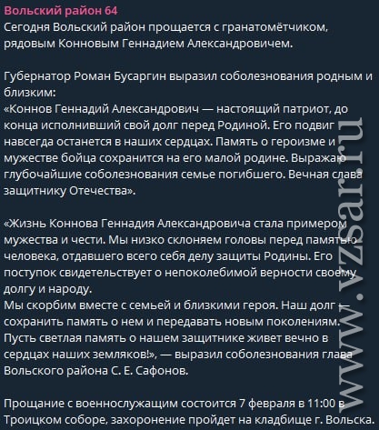 О прощании с гранатометчиком, рядовым Геннадием Конновым рассказала администрация Вольского района. Сегодня в Вольске земляки проводили Геннадия Александровича в последний путь