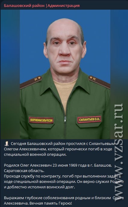 Администрация Балашовского района сообщает о гибели Олега Силантьева. Родился Олег Алексеевич 23 июня 1969 года в Балашове. Проходил службу по контракту, погиб при выполнении задач в ходе СВО.