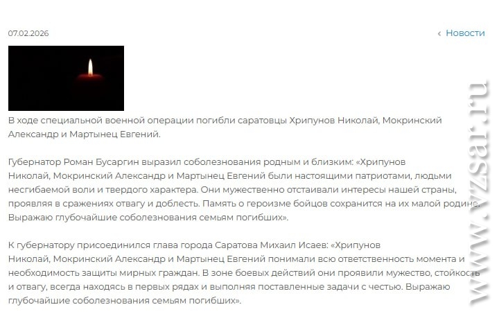 Официальный сайт мэрии Саратова коротко сообщил о гибели Николая Хрипунова, Александра Мокринского и Евгения Мартынца.