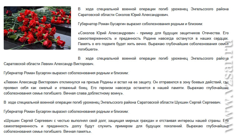 Администрация Энгельсского района сообщила о гибели Юрия Соколова, Александра Левкина, Сергея Шукшина.