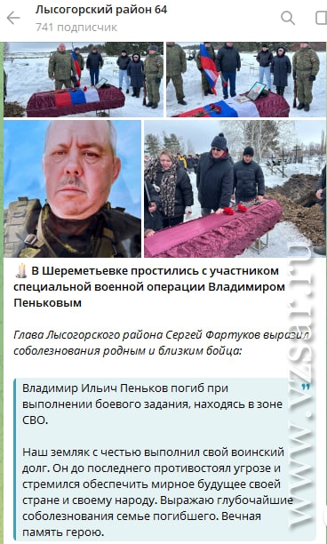 Вчера в селе Шереметьевка простились с Владимиром Пеньковым, погибшим при выполнении боевого задания, сообщила администрация Лысогорского района.