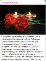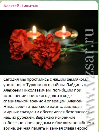 Глава Турковского района Алексей Никитин сообщил о том, что вчера простились с Алексеем Лайдиным.